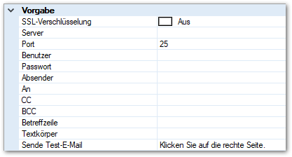 (am Ende dieser Zeile) können Sie eine Test E-Mail absetzen und damit eine Überprüfung Ihrer Angaben durchführen. Hierzu müssen alle anderen Felder im Abschnitt Standard korrekt ausgefüllt sein, zudem muss ein Empfänger angegeben werden (siehe unten, Abschnitt Vorgabe, in der Zeile An). Betreffzeile und Textkörper brauchen nicht spezifiziert zu werden.
