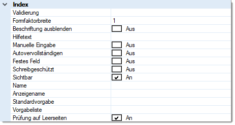 Sollen Indexfelder mit Werten befüllt werden, die Anwender nicht sehen sollen (z.B. Zwischenergebnisse oder vertrauliche Daten aus Datenbanken), können diese im Indexfenster komplett ausgeblendet werden. Die Inhalte solcher Felder stehen dennoch für die weitere automatische Verarbeitung (z.B. für den Export in Indexdateien) zur Verfügung.