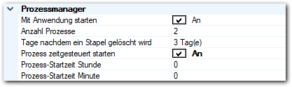Laufen zur Startzeit des Prozessmanagers (siehe Prozess zeitgesteuert starten, weiter unten) keine anderen Programme, dann sollten Sie die Anzahl der Prozesse zur Verbesserung der Abarbeitungsgeschwindigkeit auf den Maximalwert heraufsetzen.