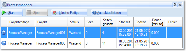 Die an den Prozessmanager übergebenen Stapel werden zeilenweise aufgeführt, die Spalte Status signalisiert den aktuellen Stand jedes einzelnen Stapels.