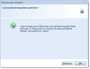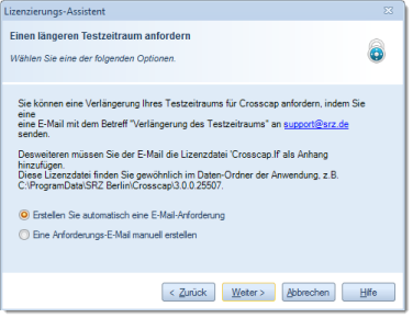 Leider können CROSSCAP Lizenzen nicht on-line erworben werden. Kontaktieren Sie bitte stattdessen unseren Vertrieb, entweder per Telefon oder per e-Mail. Mehr Information zum Erwerb von Lizenzen finden Sie auch auf unserer Website: www.srz.de. Klicken Sie Weiter, um zum Ausgangsbildschirm des Lizenzierungs-Assistenten zurückzukehren. |