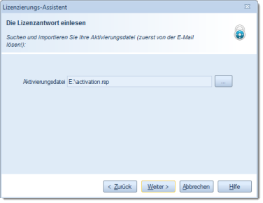 Als Nächstes müssen Sie dem Lizenzierungs-Assistenten den Speicherort der Aktivierungsdatei mitteilen. Geben Sie entweder den vollständigen Pfad und Dateinamen händisch ein oder verwenden Sie die Sobald die Aktivierungsdatei korrekt angegeben wurde, klicken Sie bitte auf Weiter. |