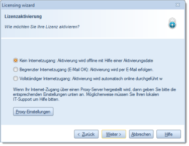 Je nach Auswahl verhält sich der Lizenzierungs-Assistent ab hier sehr unterschiedlich. Bitte folgen Sie den Anweisungen im entsprechenden Abschnitt, weiter unten: