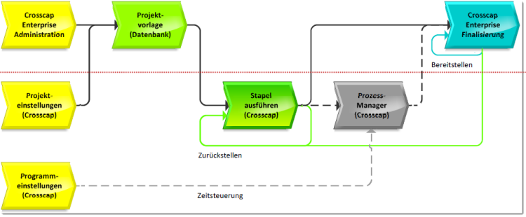Die folgende Grafik erläutert die grundlegende Arbeitsweise mit Stapeln, wenn CROSSCAP im Verbund eines CROSSCAP Enterprise Systems betrieben wird. Die Elemente über der gestrichelten, roten Linie beziehen sich auf CROSSCAP Enterprise, die Elemente unterhalb der Linie beziehen sich auf CROSSCAP:
