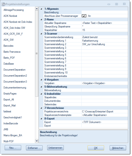 Der Name Ihrer neu angelegten Projektvorlage sollte nun links oben in der Liste der Projektvorlagen erscheinen. Stellen Sie bitte sicher, dass diese neue Projektvorlage markiert und farbig hinterlegt ist. Auf der rechten Seite dieses Fensters finden Sie eine Aufstellung aller Funktionen, die Sie im Profi-Modus in beliebiger Reihenfolge und frei nach Ihren Wünschen definieren können. Die hier benötigten Abschnitte 1 - 8 werden weiter unten im Detail besprochen.