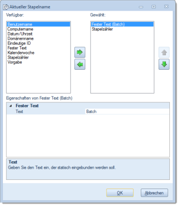 Ein Stapelname darf nicht nur in Form eines einfachen Textes frei vergeben werden, sondern er kann aus unterschiedlichen Bestandteilen dynamisch zusammengefügt werden. Einen Überblick über die möglichen und aktuellen Bestandteile eines Stapelnamens erhalten Sie nach einem Klick auf die Schaltfläche für die erweiterte Eingabe: