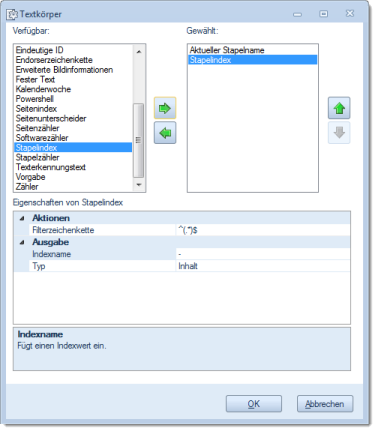 Markiert man im rechten Fenster einen der aktiven Einträge, dann kann dieser mit Hilfe der vertikalen, grünen Pfeile auf oder ab bewegt werden. Dies verändert die Reihenfolge der späteren Abarbeitung (die Variablen werden von oben nach unten abgearbeitet).
