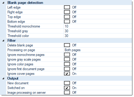 Specifically applies to multistream mode. If any of these three filters are set to On, blank page detection is turned off for the respective page types. Please note that combining all three options Ignore monochrome pages, Ignore gray scaled pages and Ignore color pages will effectively turn off blank page detection, all together, since there are no images left to process.