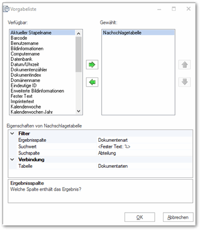 Wählen Sie als erstes unter Verbindung eine der verfügbaren Nachschlagetabellen aus, danach können Sie unter Filter als Ergebnisspalte eine der Tabellenspalten als Quelle für die Erzeugung der Vorgabeliste auswählen.