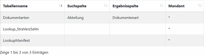 Jede Nachschlagetabelle belegt in dieser Liste eine Zeile. In diesem Beispiel wurde die oberste Nachschlagetabelle über das System-Cockpit angelegt und befüllt, im Fall der beiden anderen Tabellen wurde diese extern über Datenbank-Tools erzeugt und anschließend hier eingebunden.