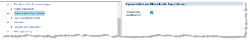 Ist diese Option eingeschaltet (Häkchen gesetzt), dann überschreibt CROSSCAP Enterprise V4 existierende Dateien ohne Rückfrage. Ist diese Option ausgeschaltet (Häkchen nicht gesetzt), dann wird der Exportprozess an dieser Stelle abgebrochen. Vom CROSSCAP Enterprise V4 Server wird dann eine entsprechende Fehlermeldung ausgegeben.