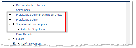Das hier definierte Projektverzeichnis und Stapelverzeichnistemplate werden bei der Fertigstellung eines Stapels mit den in den Export-Definitionen festgelegten Unterverzeichnissen und Dateinamen kombiniert, um beim Export der Scanprodukte (also beim Schreiben der Ausgabedateien) die jeweils verwendeten vollständigen Ausgabepfade und Dateinamen zu erzeugen.