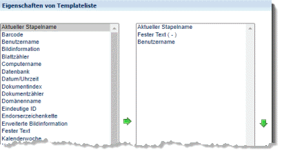 Durch Markieren eines der Einträge im Eigenschaften von ... Menü und Betätigung eines der horizontalen, grünen Pfeile können Einträge zwischen den beiden Fenstern verschoben werden, also Variable hinzugefügt (nach Rechts) oder entfernt (nach Links) werden. Markiert man im rechten Fenster einen der aktiven Einträge, dann kann dieser mit Hilfe der vertikalen, grünen Pfeile auf oder ab bewegt werden. Dies verändert die Reihenfolge der späteren Abarbeitung (die Variablen werden von oben nach unten abgearbeitet).