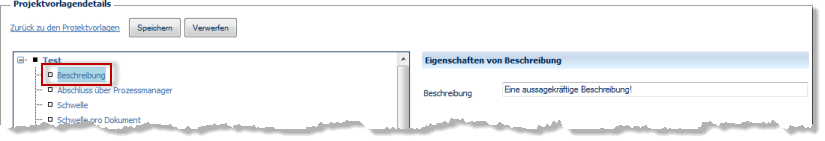 Wählen Sie im Konfigurationsbaum (links) den zu ändernden Eintrag (hier: Beschreibung). Klicken Sie mit der Maus ein Mal in das Eingabefeld rechts (Fenster: Eigenschaften von Beschreibung, Eingabefeld: Beschreibung). Geben Sie Ihren Text ein. Klicken Sie mit der Maus ein Mal in einen Bereich ausserhalb des Eingabefeldes (z.B. direkt unter dem Eingabefeld). Die Schaltflächen Speichern und Verwerfen erscheinen. Betätigen Sie die Speichern Schaltfläche, um Ihre Änderungen abzuspeichern.