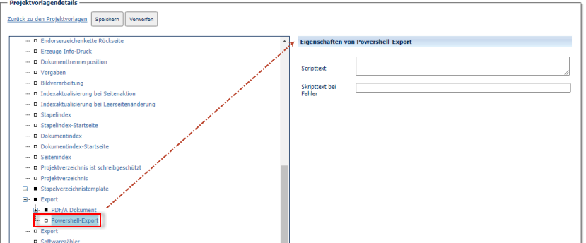 Achtung! Der PowerShell-Export darf nur in Kombination mit mindestens einer weiteren, Bilddaten enthaltenden Export-Option (hier z.B. die Export-Option PDF/A Dokument) verwendet werden, ansonsten erscheint eine Fehlermeldung und das Abspeichern der Projektvorlage wird verhindert.
