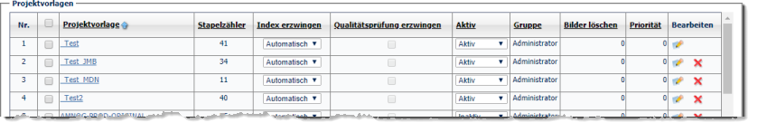Über die Schaltflächen in der Spalte Bearbeiten können die hier angzeigten Einstellungen für einzelne Projektvorlagen bearbeitet oder Projektvorlagen vollständig gelöscht werden. Die Löschung wird unterbunden (das rote Kreuz wird dann nicht mehr angezeigt) falls eine Projektvorlage in Gebrauch ist (d.h. sobald für diese Projektvorlage aktive Stapel existieren).