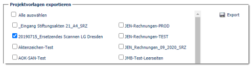 Hierzu sind im oben gezeigten Bildschirmdialog zuerst die zu exportierenden Projektvorlagen auszuwählen. Über Alle auswählen können vorher sämtliche Projektvorlagen pauschal abgewählt oder selektiert werden.