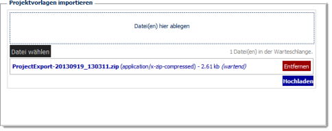 Fertige Projektvorlagen können aus anderen CROSSCAP Systemen übernommen werden. Vorab müssen sie dort als *.ZIP Datei exportiert worden sein (siehe Projektvorlagen exportieren, ganz unten).