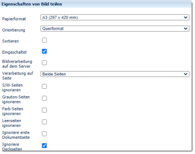 Geben Sie hier das Seitenformat der aufzuteilenden Scan-Vorlagen an. Dies schränkt diese Funktion auf die gewünschten Vorlagengrößen ein, Vorlagen mit anderem Format werden ignoriert (Beispiel: Ein Stapel mit vorwiegend A4 Dokumenten und einigen eingestreuten A3 Dokumenten, die aufgeteilt werden sollen - hier würden Sie als Papierformat "A3" angeben).
