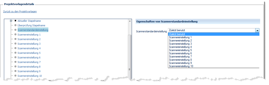 Wählen Sie hier eine passend konfigurierte Scannereinstellung (siehe nächster Abschnitt) aus, welche beim Projektstart automatisch ausgeführt werden soll. Geben Sie entweder eine der zehn vordefinierten Scannereinstellungen an (Scannereinstellung 1, Scannereinstellung 2, ... Scannereinstellung 10) oder lassen Sie die vom Anwender zuletzt verwendete Scannereinstellung (Zuletzt benutzt) erneut laden.